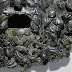 Aus dem geöffneten Mund quoll einst der Wasserstrahl. Auf der Rückseite war ursprünglich das Bleirohr der Druckwasserleitung angelötet.