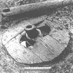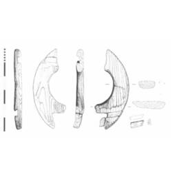 Es handelt sich um ein Seitenteil eines dreiteiligen Scheibenrades von etwa 60 cm Durchmesser mit großen halbrunden Aussparungen. Das andere Seitenteil fehlt. Ebenso die mittlere Holzbohle, in die die Achse eingesteckt war. Es ist durchaus möglich, dass Rad und Achse nicht fest miteinander verbunden waren, so dass sich das Rad frei drehen konnte.