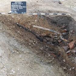 Im Zuge der Errichtung des neuen Stadtteils München-Freiham hat man bei archäologischen Ausgrabungen Siedlungsreste aus unterschiedlichen Jahrtausenden, aber auch Relikte aus der jüngsten Vergangenheit entdeckt. Am westlichen Stadtrand von München lagen ehemals das Reichsbahnwerk und ein Zweigbetrieb der Dornier-Flugwerke. Diese strategisch wichtigen Orte wurden ab Juni 1944 heftig bombardiert. Spuren dieser Bombardements haben sich in Form von Sprengkörpern und Bombentrichtern als archäologische Spuren im Boden erhalten. Unmittelbar nach Kriegsende hatte man in einem der Bombentrichter unliebsam gewordene Abzeichen des Nazi-Regimes entsorgt. Ein Akt, der während der Nazi-Herrschaft bis zum Kriegsende undenkbar gewesen und gar mit Hinrichtung geahndet worden wäre.
