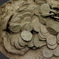 Gefunden wurde außerdem ein zerscherbtes Keramikgefäß mit über 300 römische Silbermünzen. Die jüngste von ihnen stammt aus der Regierungszeit der Kaiser Valerianus und Gallienus, also aus den Jahren nach 250 n. Chr. Den Münzfund hatte man wohl um das Jahr 259 n. Chr. versteckt, denn Münzen aus der Zeit nach 260 n. Chr. fehlen. Die Eisengeräte sind dagegen vermutlich jünger als der Münzschatz und stammen aus dem 4. Jahrhundert n. Chr.