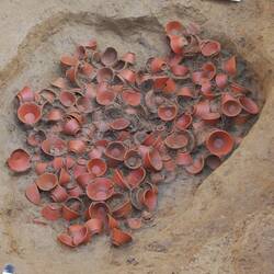 Entsorgt wurden aber auch der Schutt von abgerissenen Töpferöfen und viele gebrannte Tonbatzen. Mit diesen Batzen aus ursprünglich noch weichem Ton hatten die Brennmeister die hohen Gefäßstapel in den Öfen fixiert, damit sie nicht umfallen konnten. Beim Brennvorgang wurden die Batzen dann ausgehärtet und bewahrten somit neben den Gefäßabdrücken auch viele Fingerabdrücke der Töpfereiarbeiter.