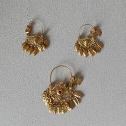 Die Ohrringe sind jeweils aus mehreren Goldblechteilen zusammengesetzt: Hauptbestandteile sind der Bügel, die halbmondförmige Platte und die Zierelemente an den Rändern.
